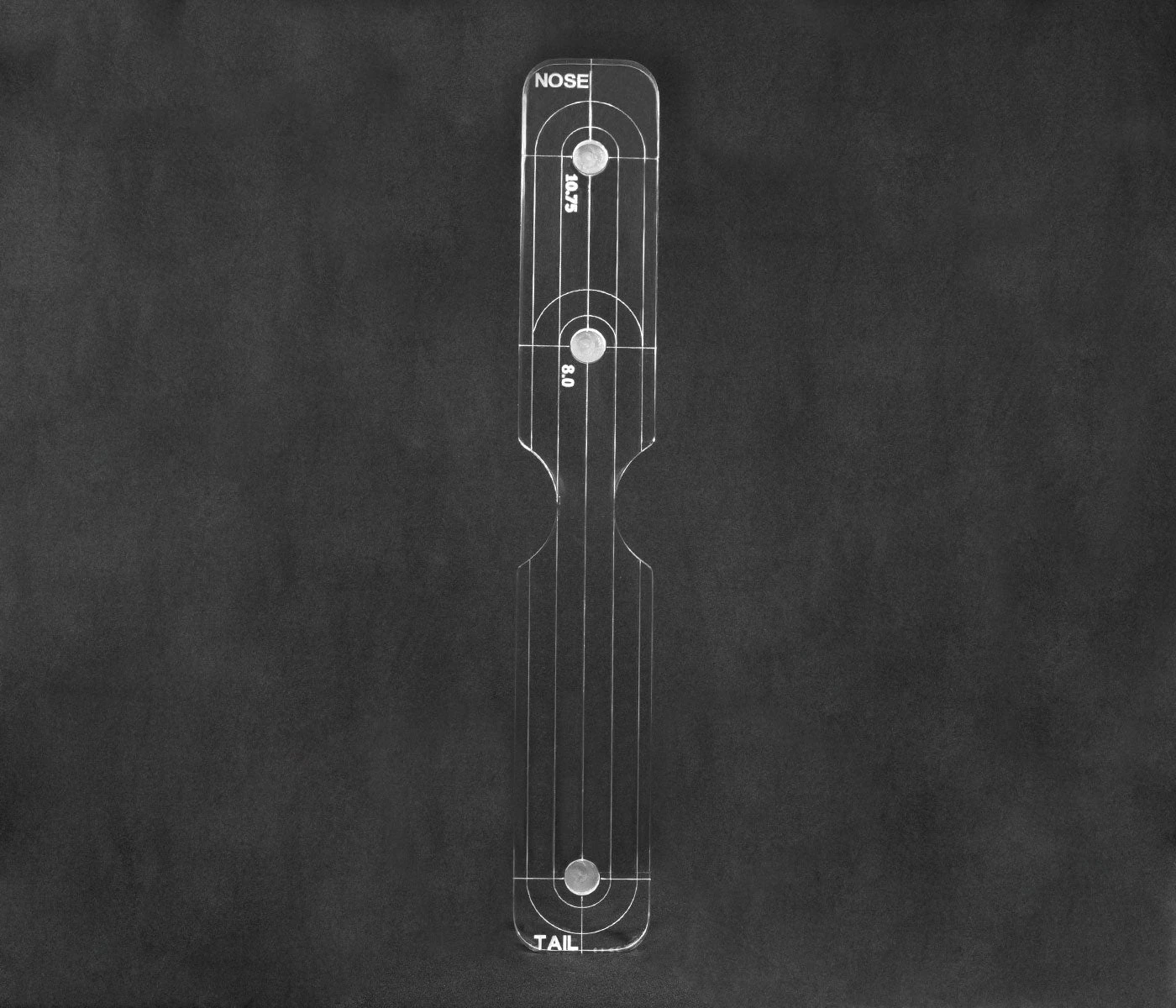 The 1-Shot Target works with the 1-Shot Jig Plate to ensures proper routing and placement for Futures 1-Shot fin boxes. The clear target has hashmarks to line up with stringer and/or shaper dots and the outline of the box. There are markings for both Futures 8.0 and 10.75″ 1-shot fin boxes.